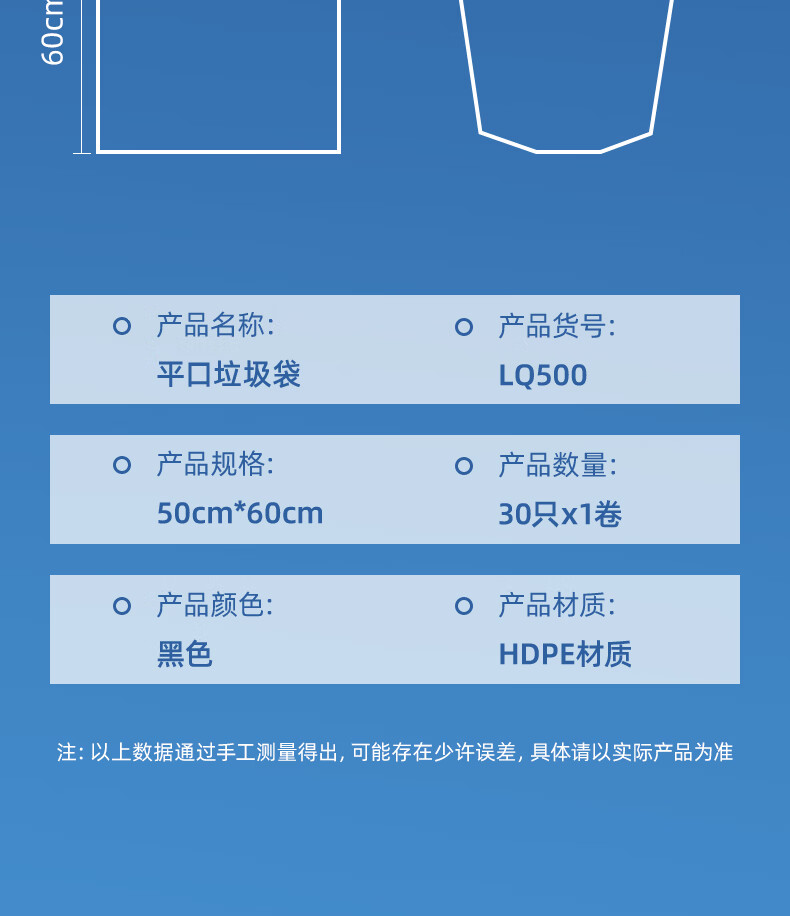 当前位置: 首页 > 生活用品 > 日用百货 > 得力得心 LQ500-平口垃圾袋(黑色)(30只卷,1卷/包)