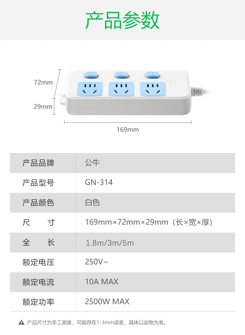 当前位置: 首页 > 电脑数码 > 电源相关 > 公牛(BULL)GN-314 插座/插线板/插排/排插/接线板/拖线板 3位分控全长1.8米/3米/5米