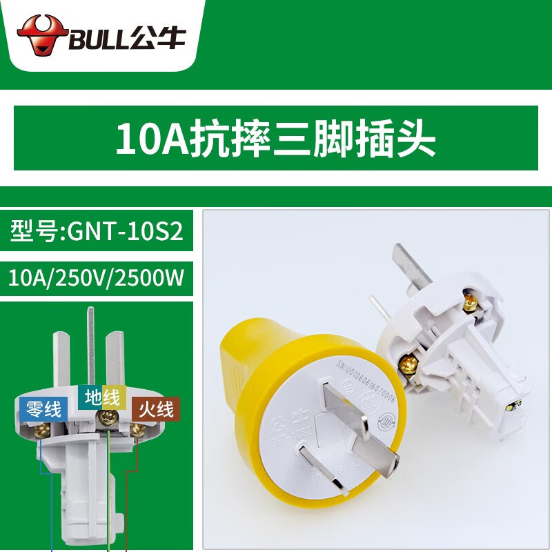 公牛 插头二脚三脚插头空调插 16安 插头电线电源插头/无线/自行接线 10A三脚防摔插头T-10S2