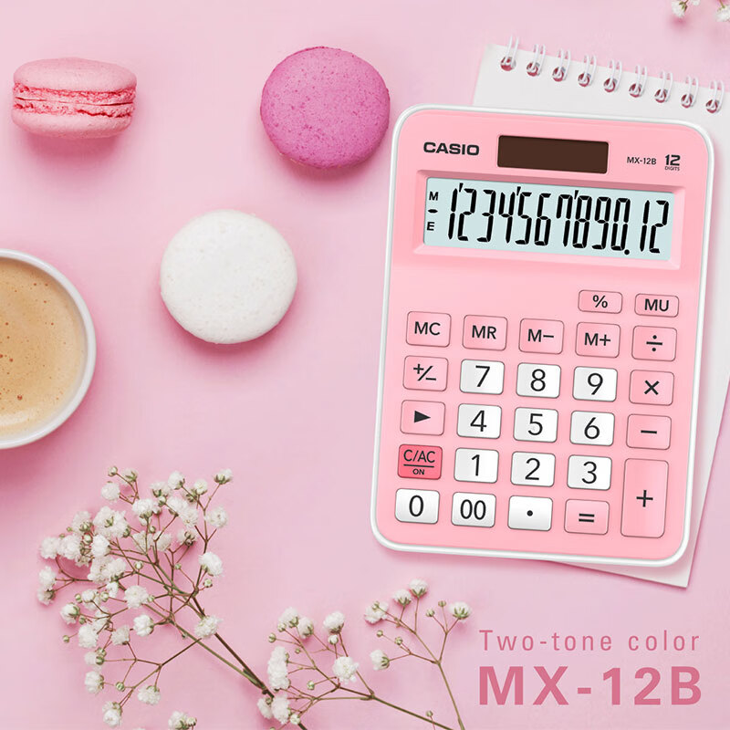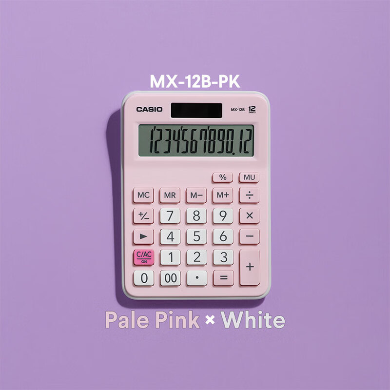 卡西欧(CASIO)MX-12B-PK小学生计算器无语音小型款可爱计算机器太阳能双电源(粉色)