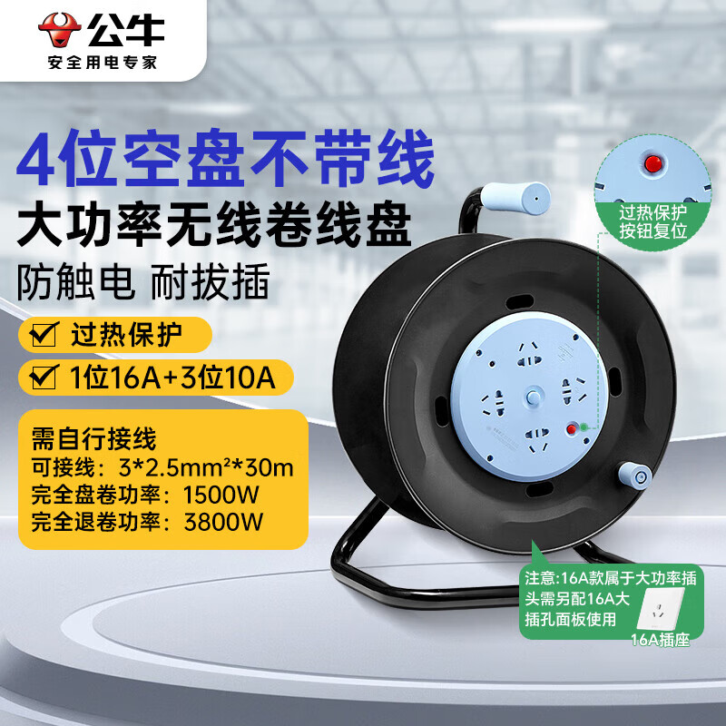 公牛(BULL)过热保护16A大功率电缆卷盘插座/插排GN-804D 四位无线卷线盘空盘工程专用(需自行接线)