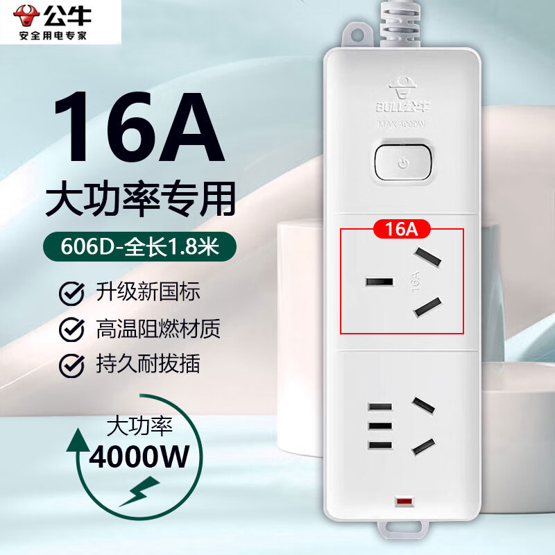 公牛(BULL)GN-606D 插座/接线板/插排/插线板/拖线板/插板 4000W大功率16A空调热水器 全长1.8米/3米