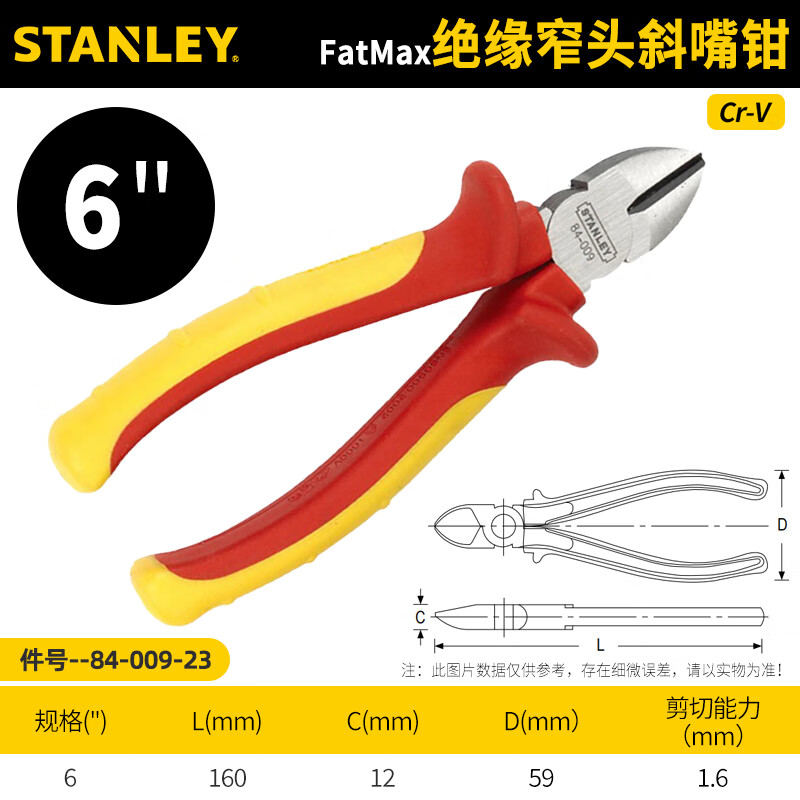史丹利(STANLEY)84-009-23 FatMax绝缘耐高压窄头斜嘴钳6寸 VDE1000V
