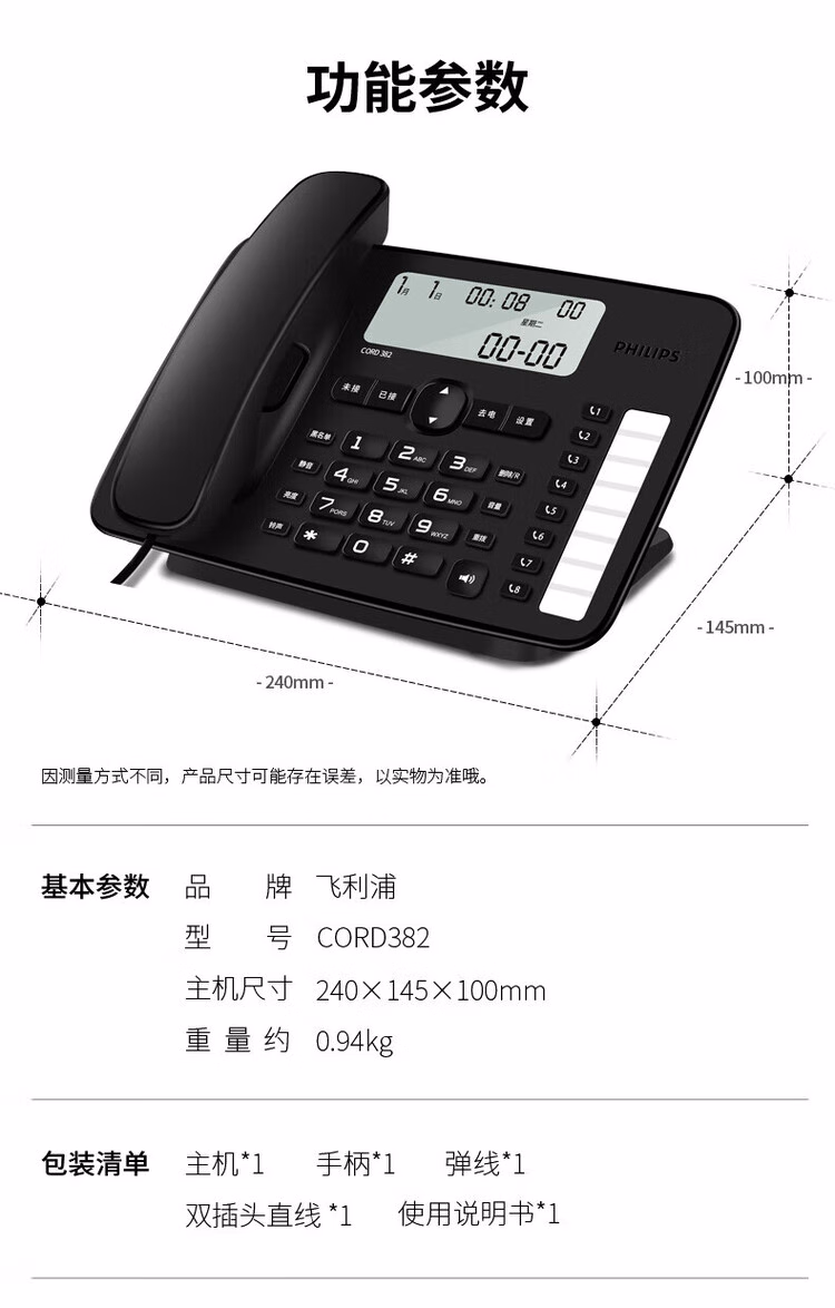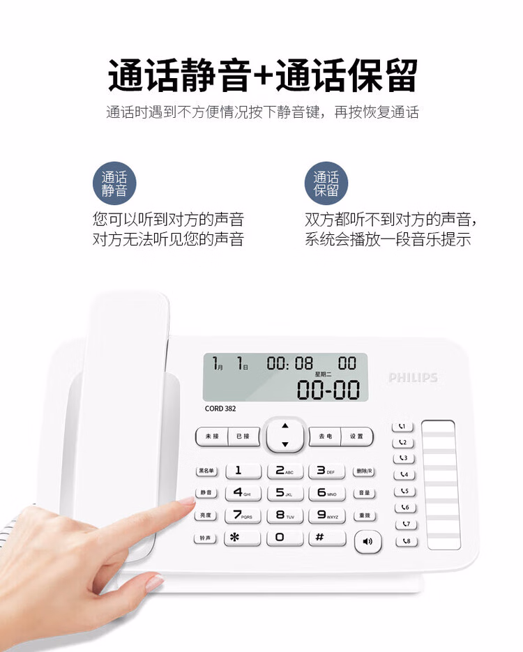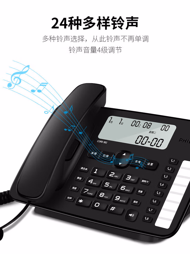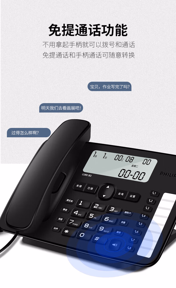当前位置: 首页 > 电脑数码 > 电话机 > 飞利浦(PHILIPS)电话机座机 固定电话 办公家用 免提通话 免电池 来电显示 8组一键拨号 黑名单 CORD382 黑色