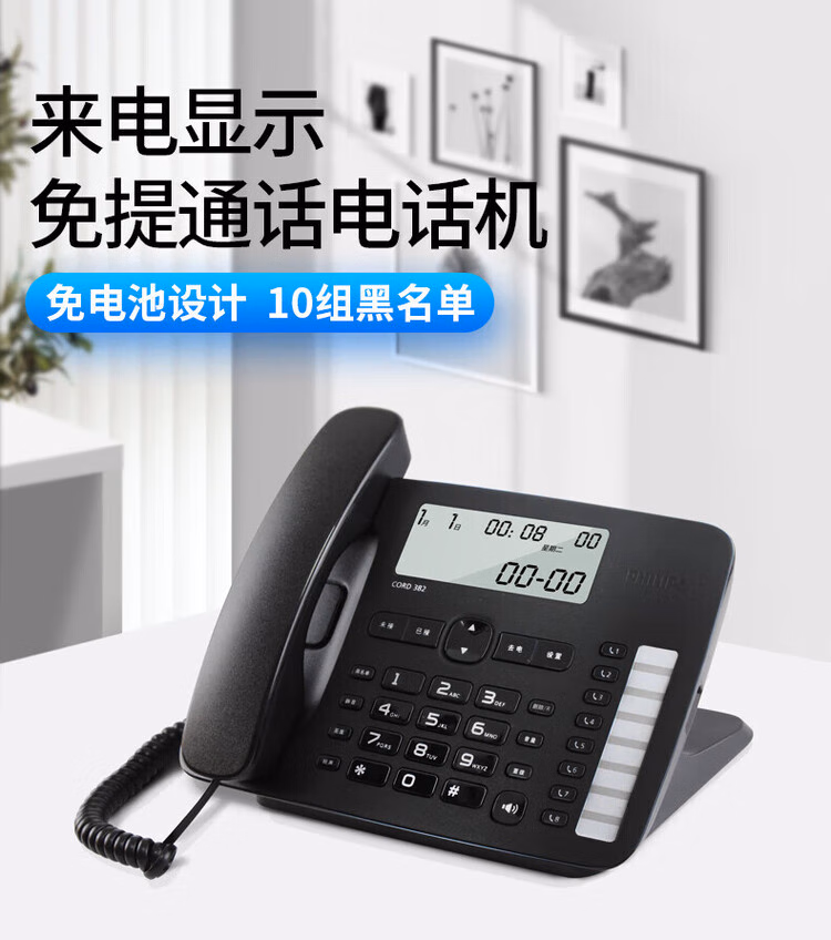 飞利浦(PHILIPS)电话机座机 固定电话 办公家用 免提通话 免电池 来电显示 8组一键拨号 黑名单 CORD382 黑色