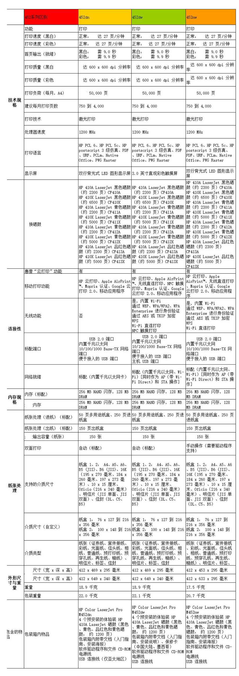惠普HP452NW A4幅面 彩色激光打印机 HP452nw标配