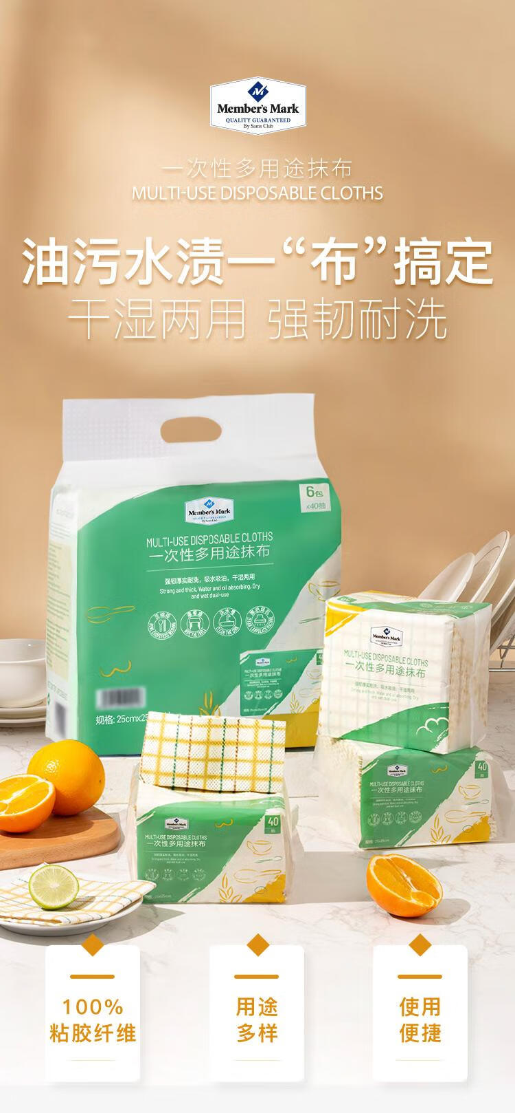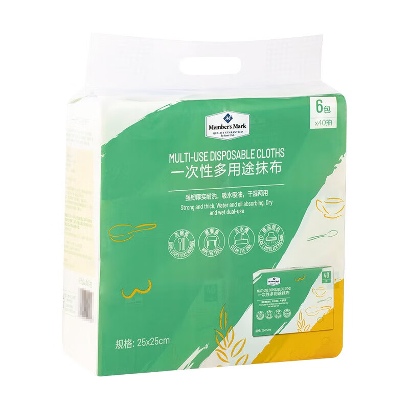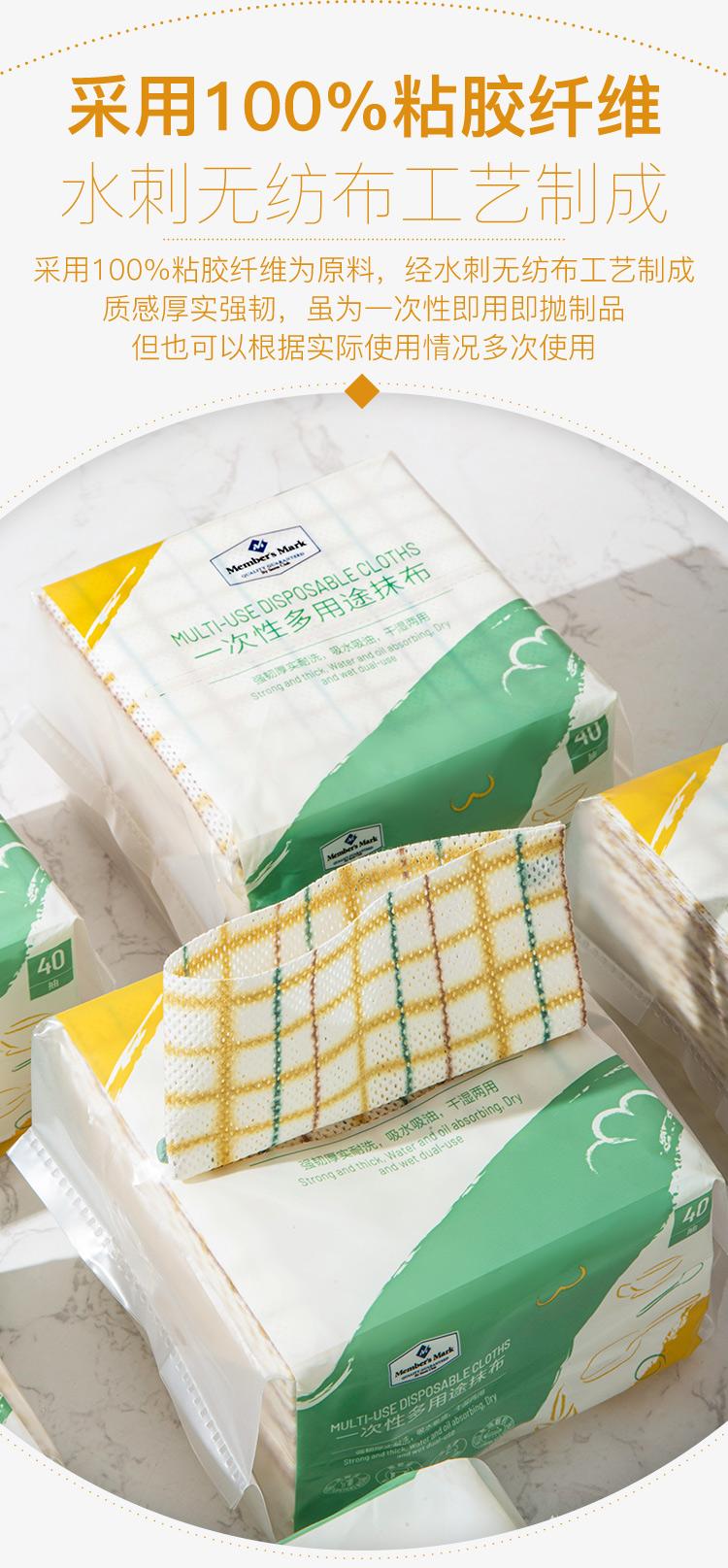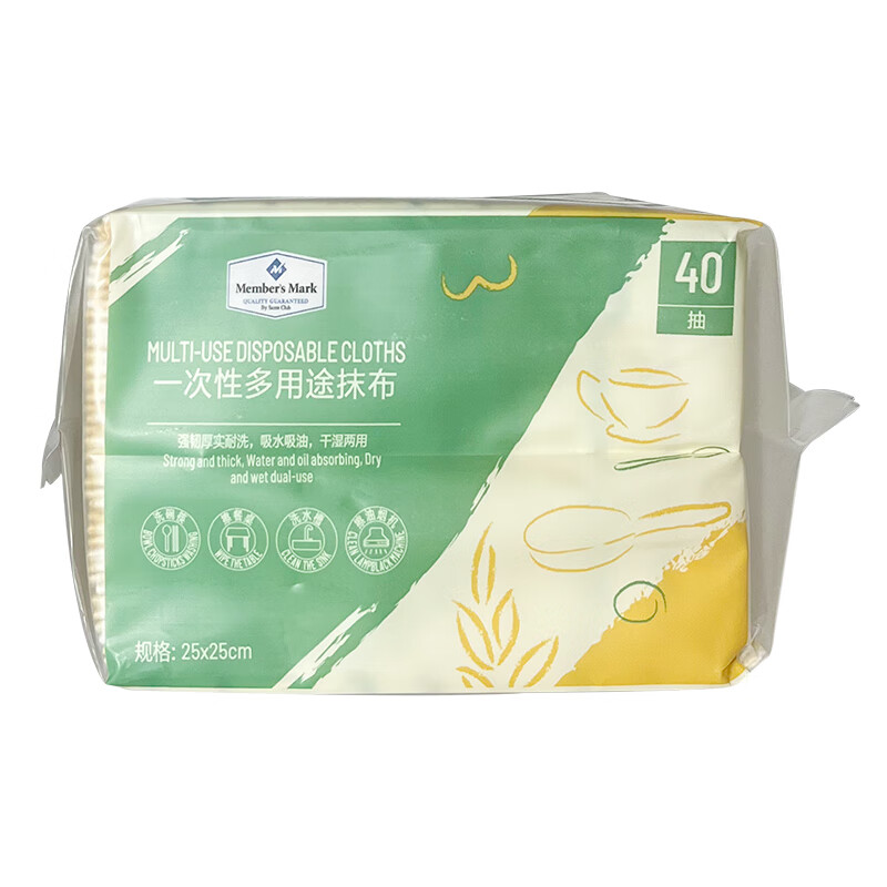 Members Mark山姆 一次性多用途抹布 抽取式洗碗巾厨房清洁去油污干湿两用强韧耐洗 40抽/包(25*25cm)