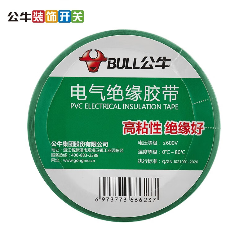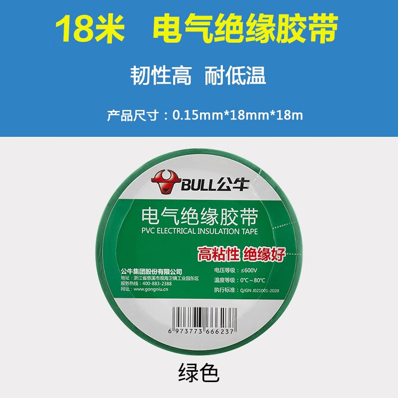 公牛(BULL)电工胶布GN-ET7电气pvc绝缘阻燃胶带防水胶布耐高温 绿色18米
